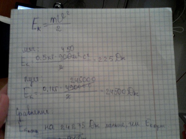 Вывод: кинетическая энергия мяча меньше чем кинетическая энергия пули на 2450Дж-225Дж=2225Дж.