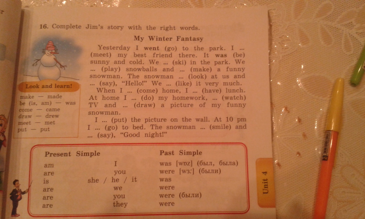 met, were sliing, were playing, were making, looked, said, liked, came, had, was doing, was watching, drew, put, went, smiled, said