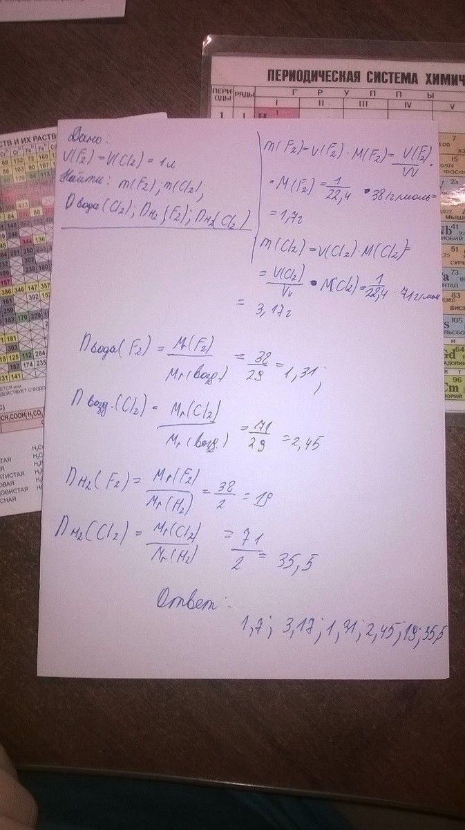 Рассчитайте массу 1 л фтора и хлора при н.у. Найдите их относительную плотность по водороду и воздуху.