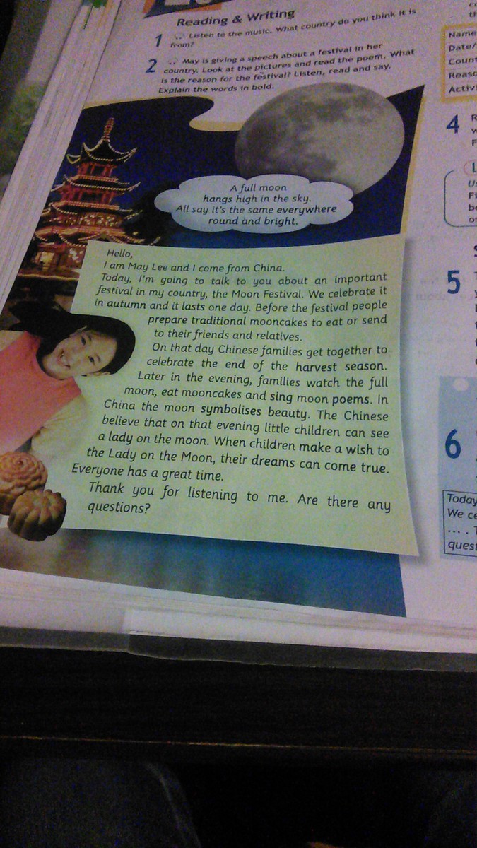 Привет, я Мэй Ли и я родом из Китая. Сегодня я собираюсь поговорить с тобой о важном фестивале в мой стране. О Лунном фестивале. Мы отмечаем его осенью, и он длится один день. Перед фестивалем люди готовят традиционные лунные пироги/торты/кексы, чтобы потом съесть их или отправить друзьям и родственникам. В этот день семьи Китая собираются вместе,чтобы отпраздновать конец сезона сбора урожая. Позже вечером семьи смотрят на полную луну, едят лунные пироги и поют лунные поэмы. В Китае луна символизирует красоту. Китайцы верят, что в этот вечер маленькие дети могут увидеть женщину на луне. Когда они загадывают желание этой женщине, мечты могут сбыться. Все проводят это время замечательно.