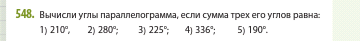 1) 360-210=150 (значит два угла 150). Тогда остальные два 360-300=60. (остальные два по 30 градусов).