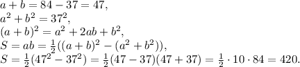 периметр прямоугольного треугольника равен 84 см , а его гипотенуза равна 37 см . найдете площадь этого треугольника . решите пожалуйста буду благодарна