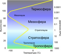 Над тропосферой находится стратосфера. Стратосфера характеризуется постоянством или ростом температуры с высотой и исключительной сухостью воздуха, почти нет водяного пара. Процессы в стратосфере практически не влияют на погоду. Стратосфера располагается на высоте от 11 до 50 км. Характерно незначительное изменение температуры в слое 11—25 км (нижний слой стратосферы) и повышение её в слое 25—40 км от −56,5 до 0,8°С (верхний слой стратосферы) . Достигнув на высоте около 40 км значения около 0°С, температура остаётся постоянной до высоты около 55 км. Эта область постоянной температуры называется стратопаузой и является границей между стратосферой и мезосферой. Именно в стратосфере располагается слой озоносферы («озоновый слой» ) (на высоте от 15—20 до 55—60 км) , который определяет верхний предел жизни в биосфере.