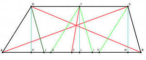 Боковые стороны AB и CD трапеции ABCD равны 12 и 16 соответственно. Отрезок, соединяющий середины диагоналей, равен 6, средняя линия трапеции равна 9. Прямые AB и CD пересекаются в точке M. Найдите длину медианы МК в треугольнике ВМС .