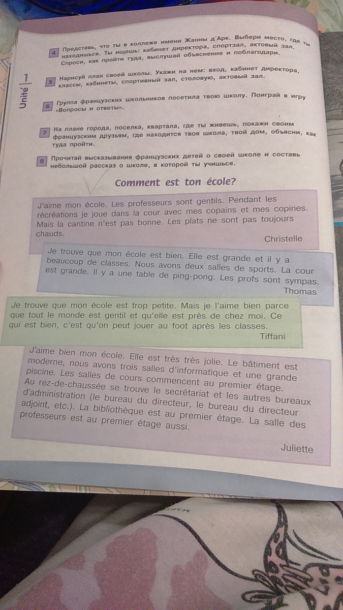 Я люблю свою школу. Преподаватели приятно. Во время перерыва я играю во дворе с друзьями и подругами. Но столовая не очень хорошо. Блюда не всегда горячая Кристель я думаю, что моя школа хорошая. Это большой и есть много классов. У нас есть два спортивных зала. Двор большой. Существует теннисный стол. Преподаватели приятно. Томас Я думаю, мой школьный слишком мал. Но мне нравится это, потому что все это хорошо, и это близко к дому. Что приятно, что вы можете играть в футбол после школы. Тиффани Мне нравится моя школа. Она очень красивая. Современное здание, у нас есть три компьютерных класса и большой бассейн. Классные комнаты начать первый этаж. Администрация заместитель Секретариат и другие офисы, и т.д.). (Директор офиса, офис учителей Библиотека находится на первом этаже в комнате на первом этаже тоже. Джульетта