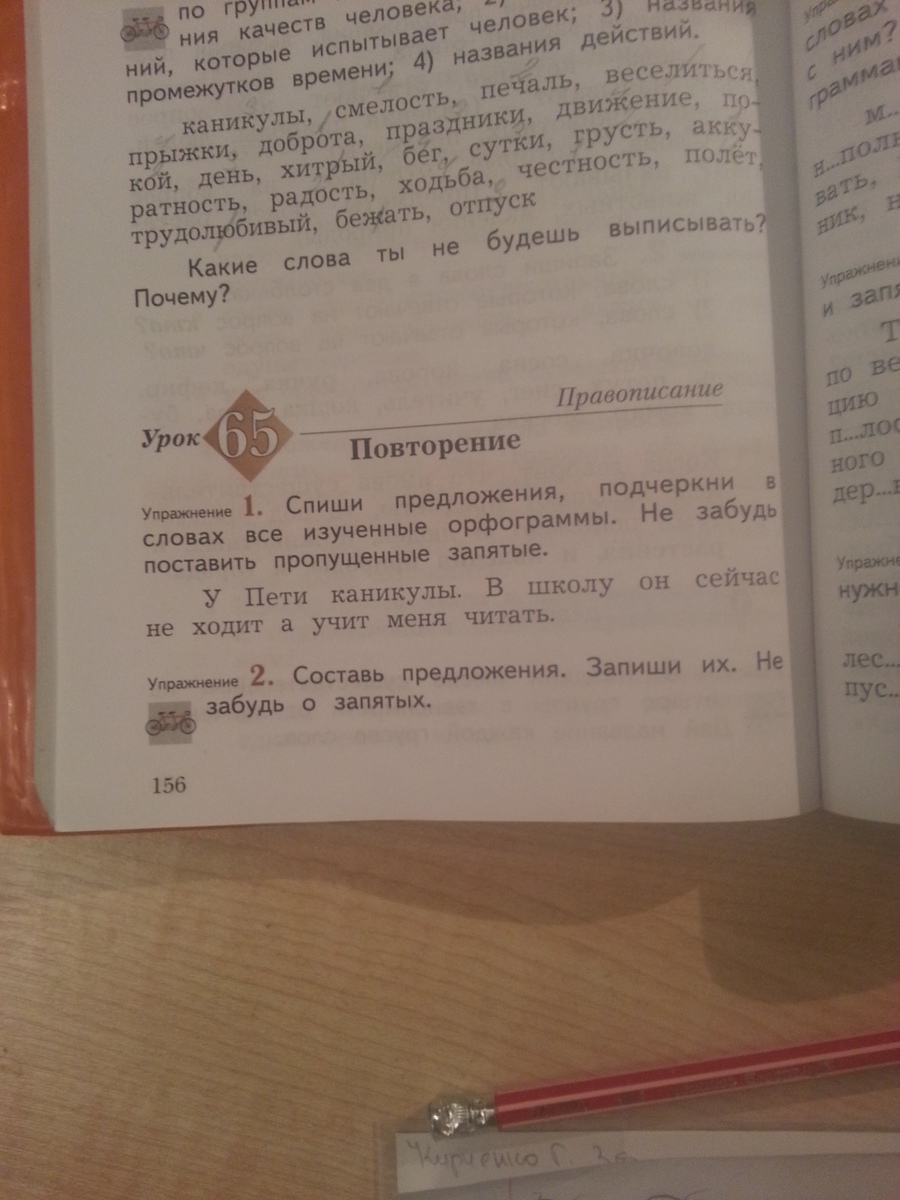 подчеркнуть каникулы, школы, ходит, учит. Запятая ставится перед буквой а. Не ходит, а учит