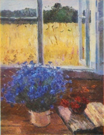 Передо мной расположено довольно красивое изображение увядающей природы. На заднем плане можно увидеть яркое поле пожелтевшей травы. Разглядывая эту картину можно осознать всю суть пролетевших месяцев, "Ничто не вечно" гласит будистское высказывание, относящиеся и к природе. На переднем плане можно заметить некое пятно жизни, состоящее из молодой и зеленеющей сирени, растворённой в открытой красоте краснеющей осени, находящейся за раскрвтом окном деревянного дома.