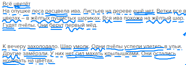 На опушке леса расцвела ива. Листьев на дереве ещё нет. Ветки все в цветах – в жёлтых пушистых шариках. Вся ива похожа на жёлтый шар. Гудят пчёлы. Они берут первый мёд.
