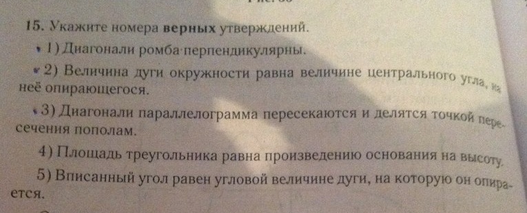 Я в 8 классе и точно знаю что правильный вариант будет 1, а третье это сво-во ромба, но так как ромб это параллелограмм значит подходит, а с остальными не могу помочь не знаю ещё