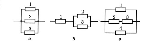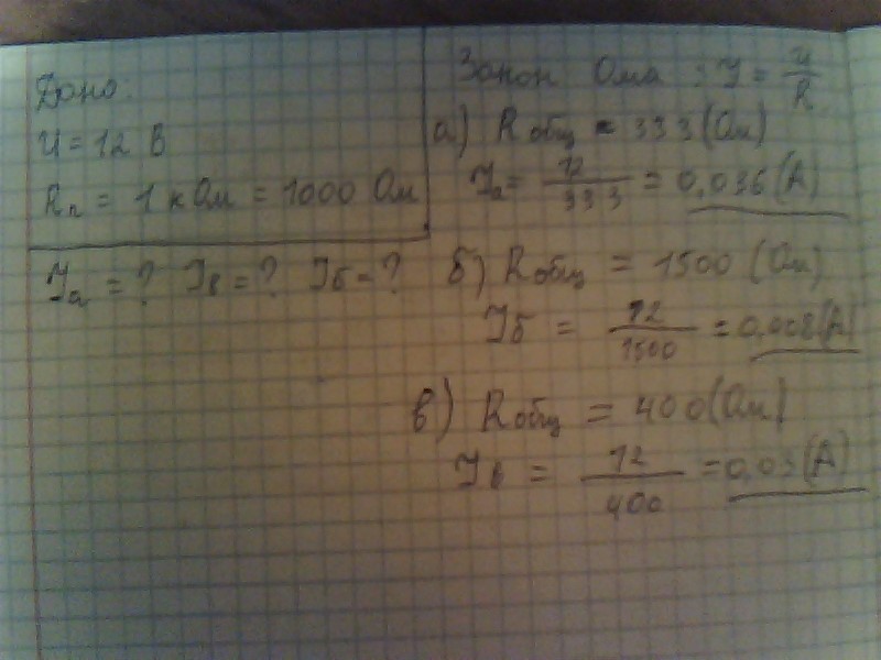 Найдите силу тока в каждом из одинаковых резисторов сопротивлением 1 кОм каждый, если к указанным участкам цепи (на рисунках а, б и в) приложено напряжение 12 В.