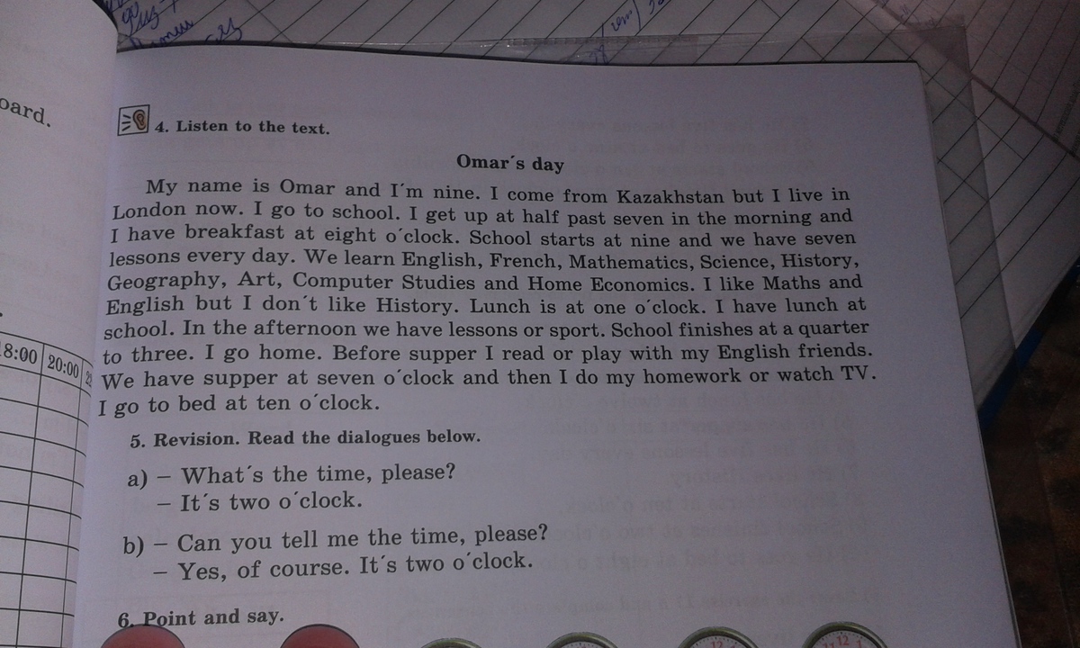 меня зовут Омар и мне 9. лет. Я из Казахстана, но сейчас я живу в Лондоне. Я ходу в школу. Я прлсыпаюсь в 7 утра и завтракаю в 8 часов. Школа начинается в 9 по 7 уроков каждый день. Мы изучаем Английский, математику, историю, географию, рисование, информатику и экономику. Я люблю математику и английский, но не люблю историю. Обед начинается в час дня. Я имею обед в школе. Ещё у нас есть физкультура. Школу заканчивает в 3 часа. Я иду домой. После прихода я читаю и играю с моими англ друзьями. Мы приходим в 7 часов и я начинаю делать д/з и смотрю телевизор. Я ложусь спать в 9