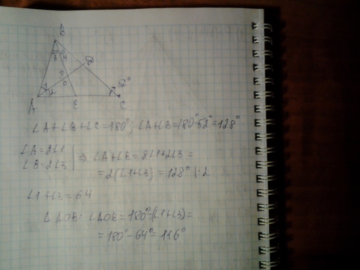 в треугольнике АВС угол С равен 52 градусам,биссектрисы AD и ВЕ пересекаются в точке О.Найдите угол АОВ.