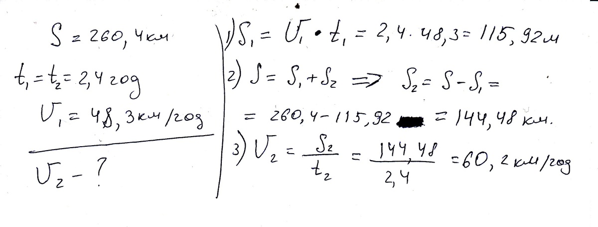 Відстань між двома містами 260.4км .Зцих міст назустріч один одному одночасно виїхали два автомобілі ,які зустрілися через 2.4 год після початку руху.Швидкість одногоз них 48.3 км/год .Яка швидкість другого автомобіля.