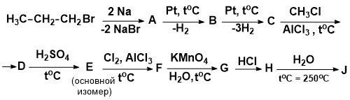 Расшифруйте цепочку превращений. Определите соединение J, назовите его по номенклатуре ИЮПАК. Обратите внимание, что при взаимодействии соединения D с H2SO4 образуется два продукта, однако последующую реакцию проводят с основным изомером E.