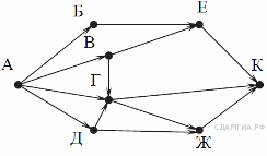 На рисунке — схема дорог, связывающих города А, Б, В, Г, Д, Е, Ж и К. По каждой дороге можно двигаться только в одном направлении, указанном стрелкой. Сколько существует различных путей из города А в город К?