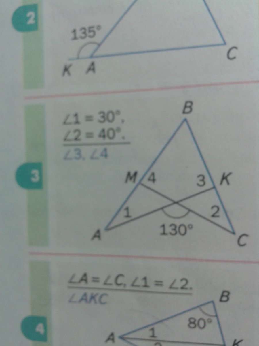 угол AOM=50, т.к он смежный с углом который 130, угол 1 30 градусов, а сумма углов треугольника=180, ищем угол AMC 180-(30+50)=100, а угол AMC смежный с углом 4, угол 4= 180-100=80, ищем угол 3. углы AOM и КОС вертикальные, значит они равны о 50, ищем угол ОКС 180-(50+40)=90, он смежный с углом 3, что бы его найти надо 180-90=90