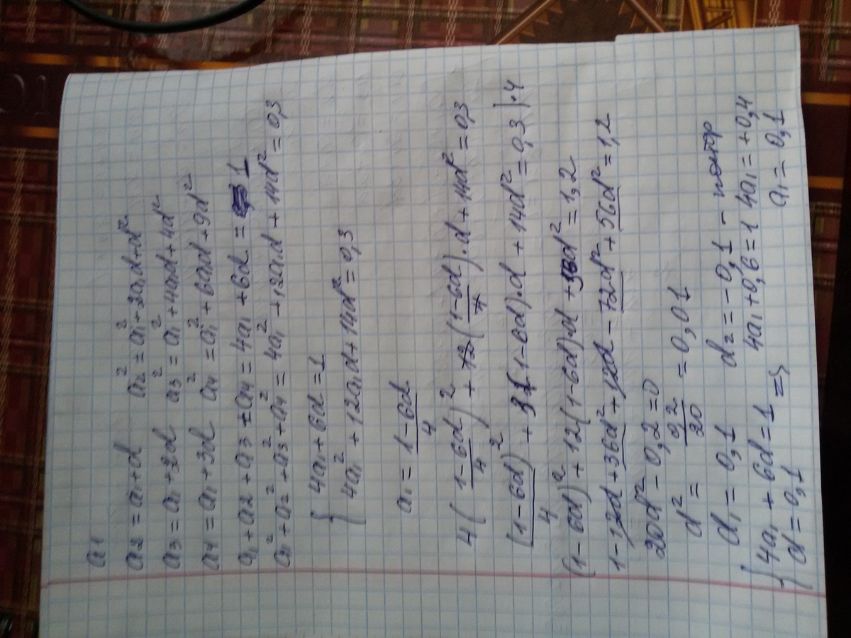 Сумма четырех чисел , образующих арифметическую прогрессию , равна 1 , а сумма квадратов этих чисел равна 0,3 . Найдите числа.