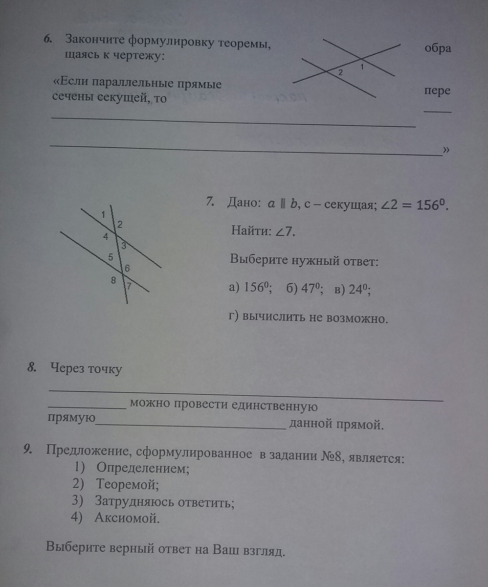 то сумма смежных углов = 180 7. 180-156=24 ответ в 8. через очку не лежащую на это прямой можно провести прямую параллельную данной прямой.
