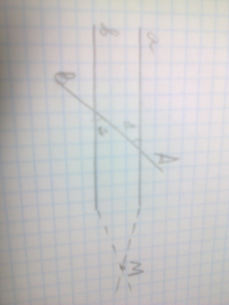 Предположим, что прямые а и b не параллельны. Тогда они пересекаются в какой-то точке М ⇒ один из углов 1 или 2 будет внешним углом Δ АВМ. Пусть для определенности ∠ 1 — внешний угол Δ АВМ, а ∠ 2 — внутренний. Из теоремы о внешнем угле треугольника следует, что ∠ 1 больше ∠ 2, а это противоречит условию, значит, прямые а и 6 не могут пересекаться, поэтому они параллельны.