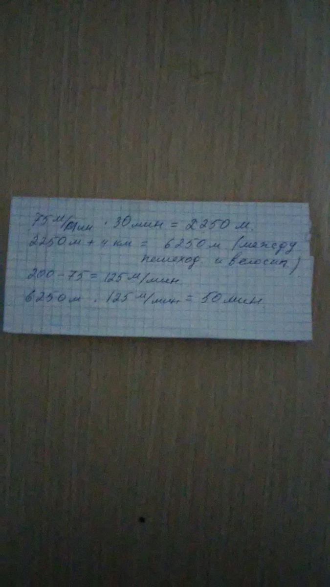 0,5ч со станции в том же направлении выехал велосипедист со скоростью 200м/мин.Через сколько минут велосипедист догонит пешехода?