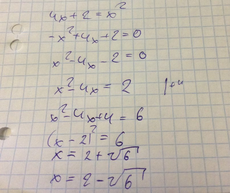 Возводим выражение в квадрат, тем самым избавляемся от корня.Переносим х в левую часть. Прибавляем 4 двум частям уравнения. Сворачиваем выражение формулой квадрат суммы и извлекаем х.