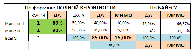 В таблице как бы два выстрела, но вероятность 0,5. Можно поставить и 0,5+0,5 выстрела