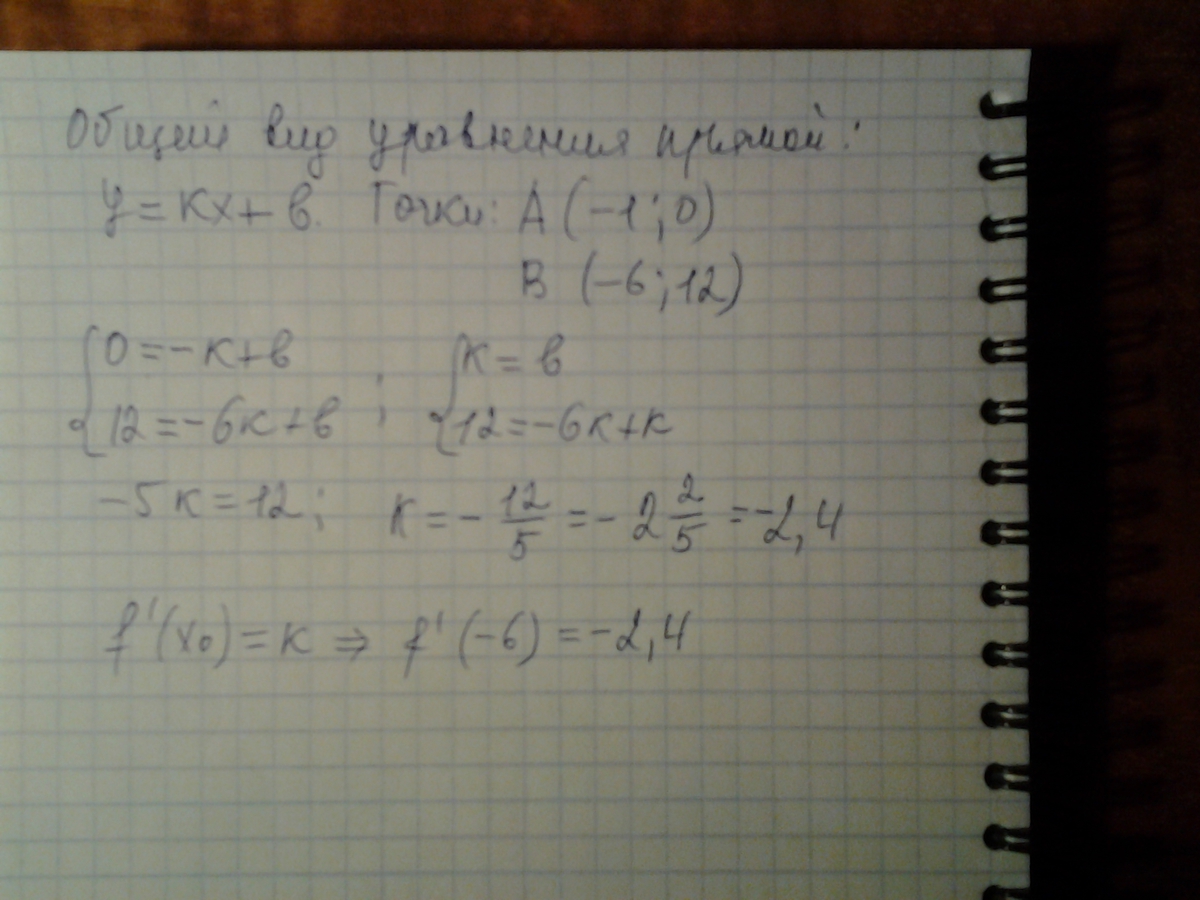 Прямая, проходящая через точку А (-1;0), касается графика функции у=f(x) в точке B (-6;12). Найдите значение производной функции f (x) в точке с абсциссой x=-6
