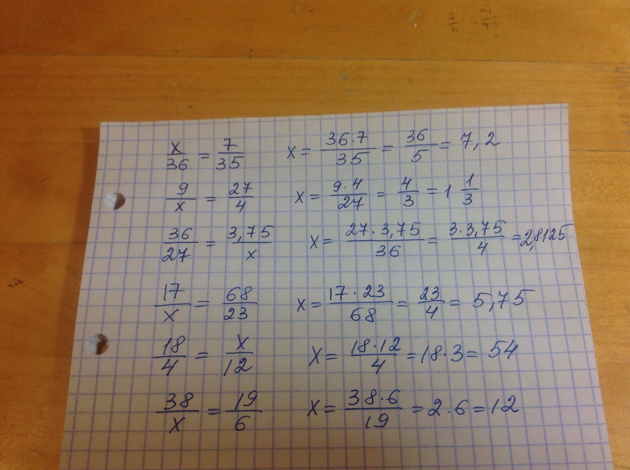 x:36=7:35; 9:x=27:4; 36:27=3,75:x;17:x=68:23; 18:4=x:12; 38:x=19:6 пожалуйста решите это математика 6 класс пропорции