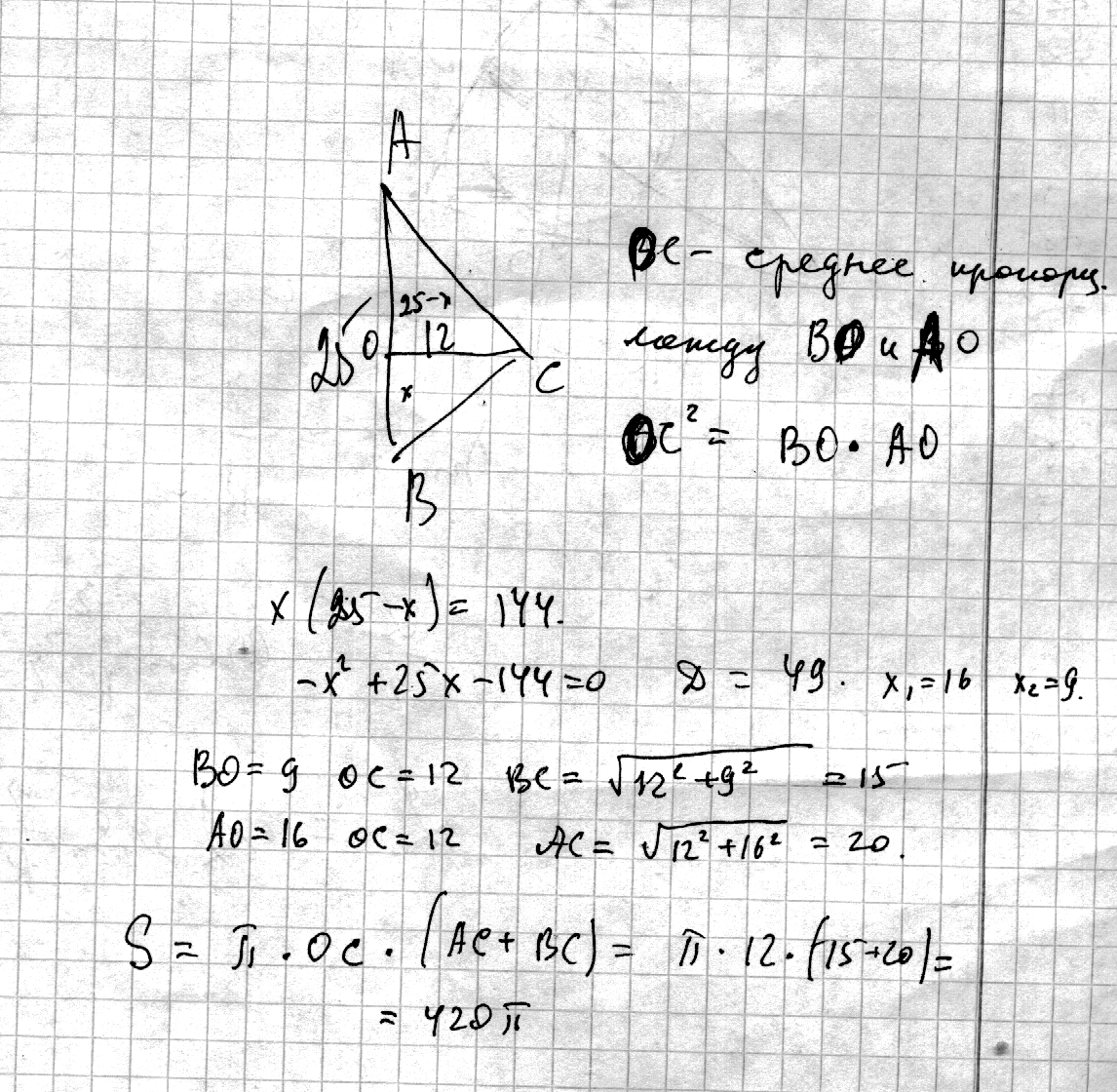 Прямоугольный треугольник с гипотенузой 25см и проведенной к ней высотой 12см вращается вокруг гипотенузы.Найдите площадь поверхности тела,полученного при вращении.