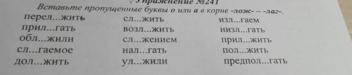Переложить, прилагать, обложили, слагаемое, доложить, сложить, возложить, сложением, налегать, уложили, излагаем, низлагать, приложить, положить, предполагать.