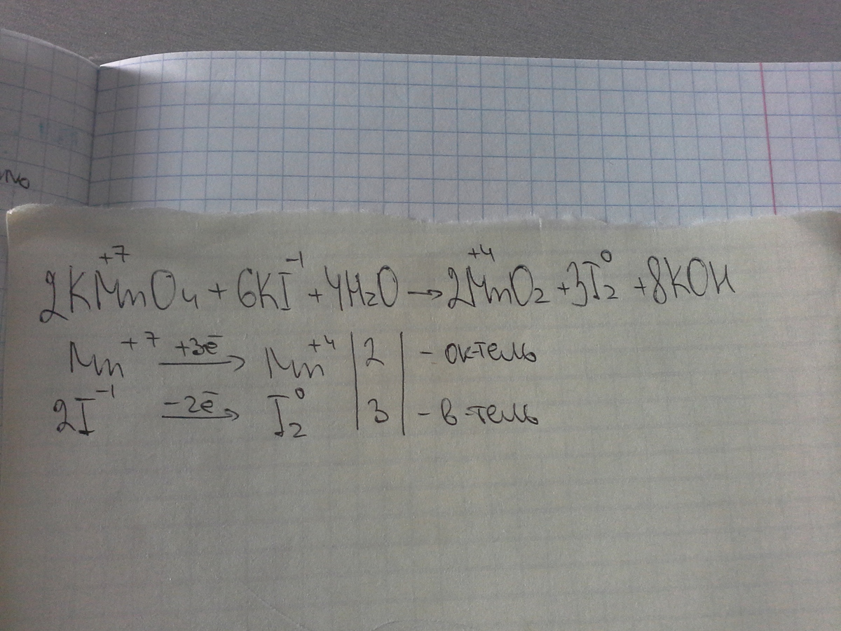 В данном уравнении расставьте коэффициенты методом ионно-электронного баланса: KMnO4 + KI + H2O → МnO2 + I2 + KOH.