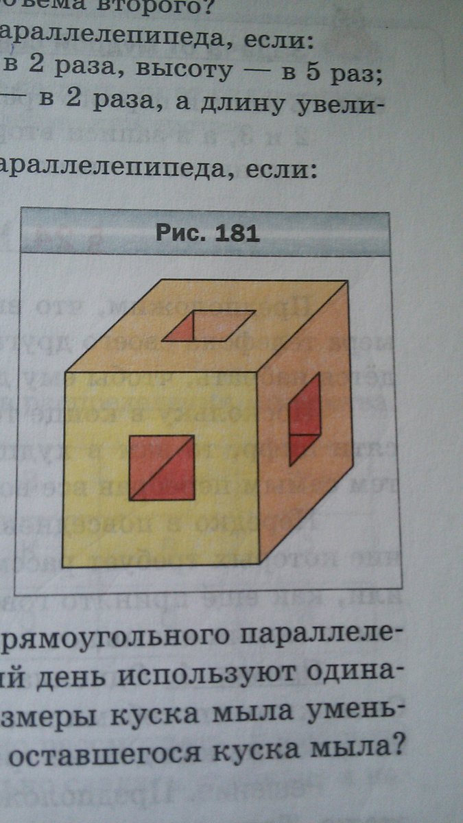 в кубе с ребром 3 см. проделали 3 сквозных квадратных отверстий со стороной 1 см.(рис181) Найдите объём оставшейся части.