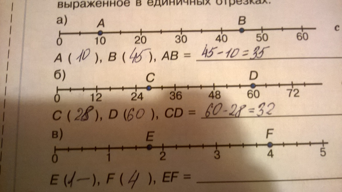 определи цену деления шкалы-с запиши координаты отмеченных точек и найди расстояние между ними,выраженное в единичных отрезках.