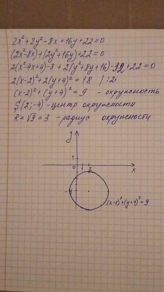Установить, какие линии определяются данным уравнением. Изобразить линии на чертеже. 2x^2 + 2y^2 - 8x + 16y + 22 =0