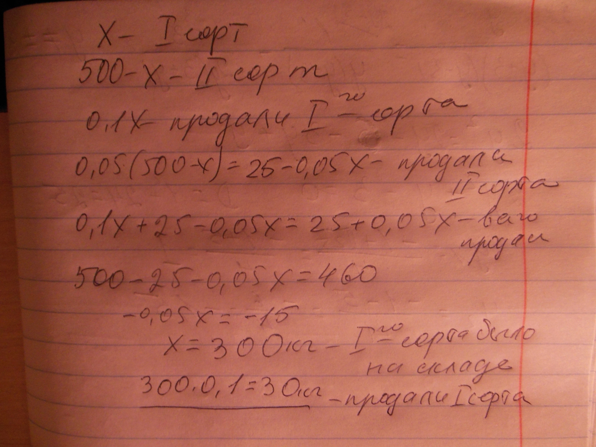 на складе хранится 500 кг картофеля 1 и 2 сортов. после продажи 10 процентов картофеля первого сорта и 5 процентов второго их масса уменьшилась до 460 кг. сколько килограмм картофеля первого сорта продали?
