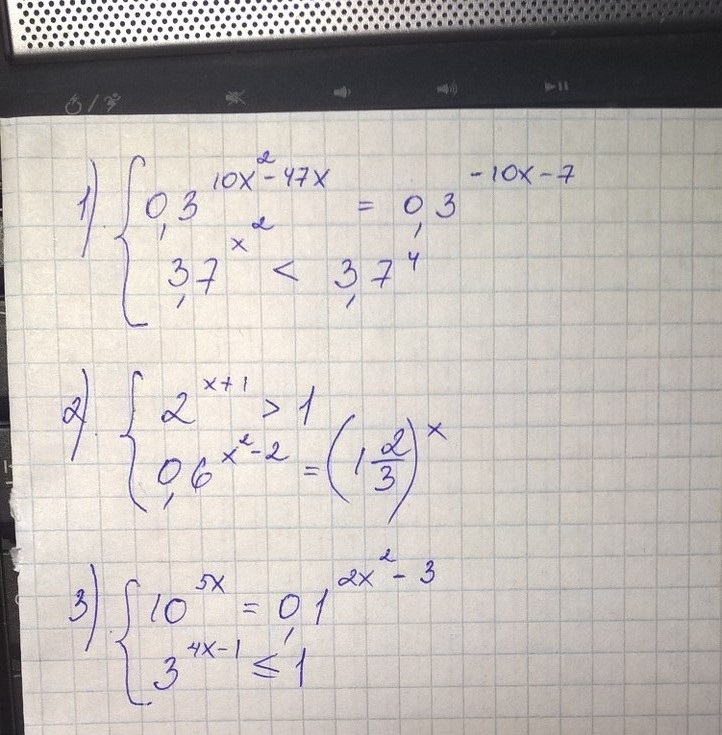 1) { 0,3^(10x² -47x) =0,3^(-10x -7) ; 3,7^x² < 3,7⁴ . .⇔
