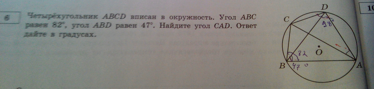 угол CAD = углу CBD = 82 - 47 = 35 (опираются на одну и ту же дугу)