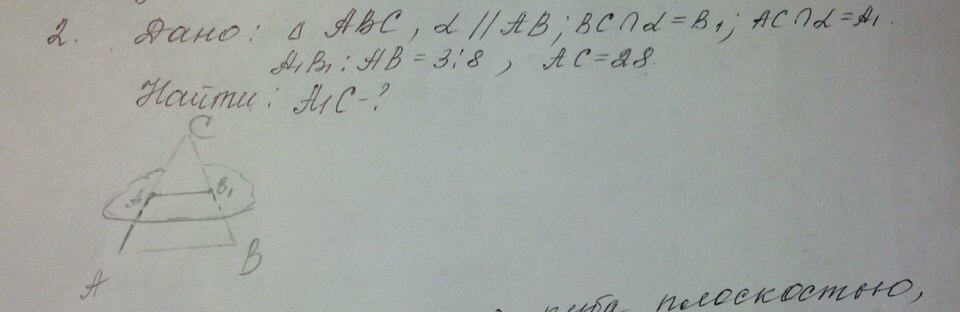 параллельна АВ, то А1В1 параллельна АВ. Треугольники А1сВ1 и АВС подобны по двум углам( угол с общий, углы А и А1 соответственные при параллельных прямых АВ иА1В1 и секущей АС). У подобных треугольников соответственные стороны пропорциональны, значит АС/А1С=АВ/А1В1, тогда 28/А1С=8/3. А1С=28*3/8=10,5
