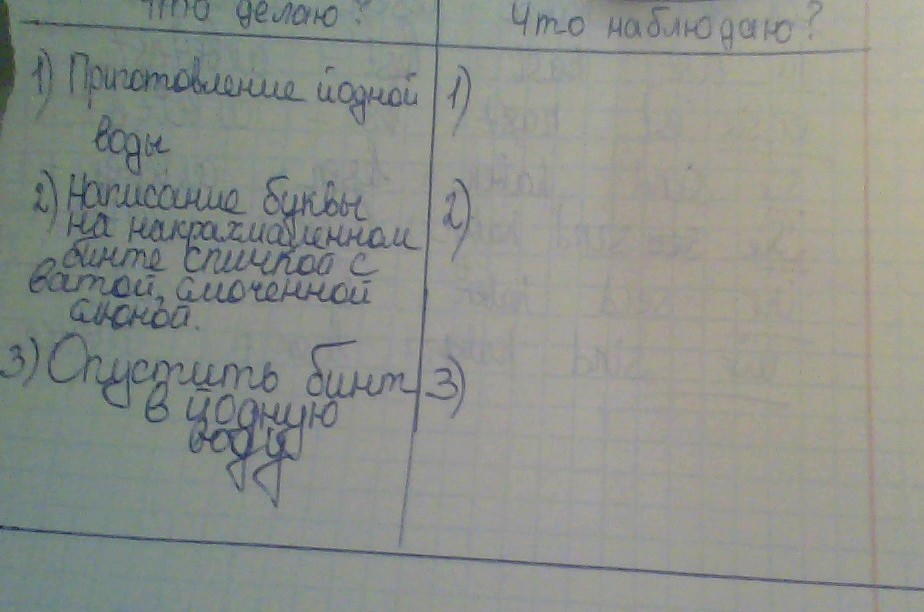 1) Приготовим раствор с крахмалом, для этого в кастрюлю со стаканом воды, насыпаем пол-ложки крахмала, поставим на огонь и доведём до однородной массы.Смочим бинт в крахмальном клейстере и дадим высохнуть ( это можно и не писать, для твой таблицы, но лучше писать). Приготовим реактив на крахмал. Возьмём блюдце и нальём немного воды и добавим несколько капель йода. Получим йодовую воду.