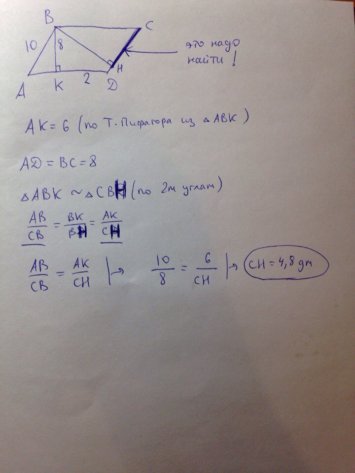 Через вершину В тупого угла параллелограмма АВСD проведена высота ВК к стороне AD. Известно , что АВ = 10 дм, ВК = 8 дм, DK = 2 дм. Вычислите длину проекции стороны ВС на прямую CD.