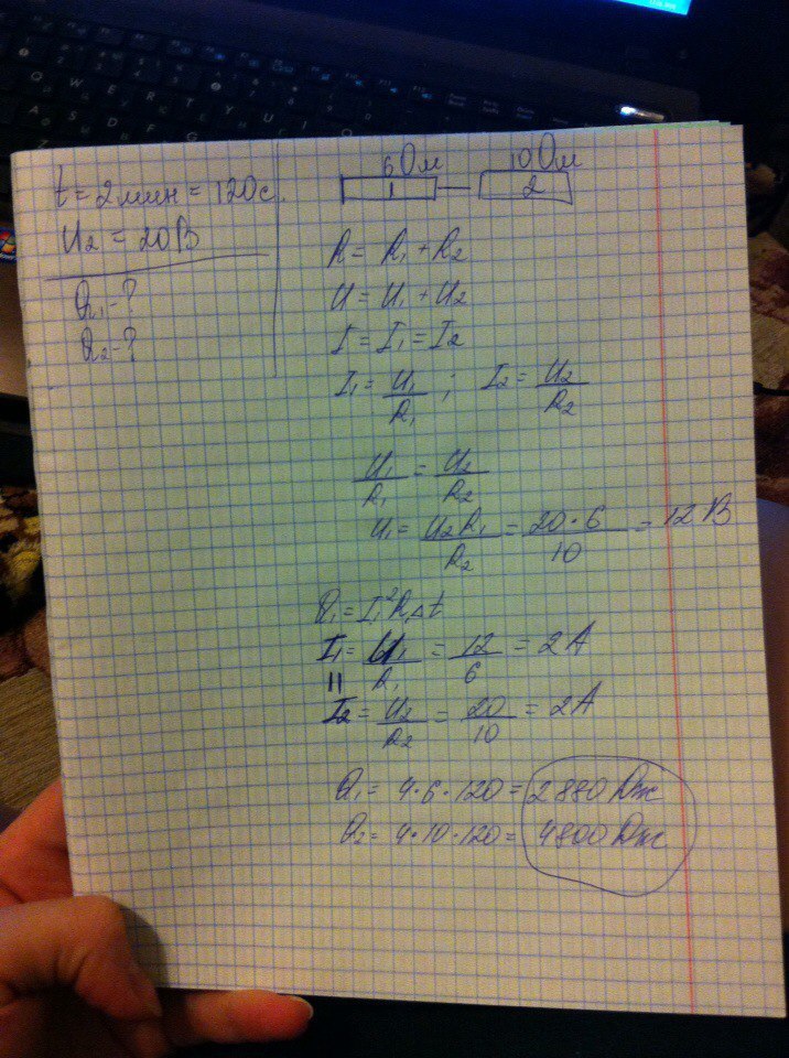 ПЛИЗЗЗ)))12б!!!Два резистори опором 6 Ом та 10 Ом включені у коло послідовно. Яка кількість теплоти виділиться у кожному резисторі за 2хв, якщо напруга на другому становить 20В?