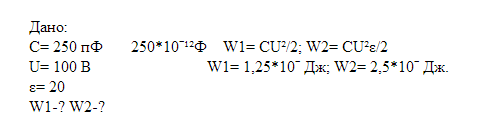 воздушный конденсатор электроёмкостью 250 пФ подключён к источнику постоянной разности потенциалов 100 В. вычислите энергию конденсатора. как изменится энергия конденсатора при заполнении пространства между пластинами веществом с диэлектрической проницаемостью Е=20?