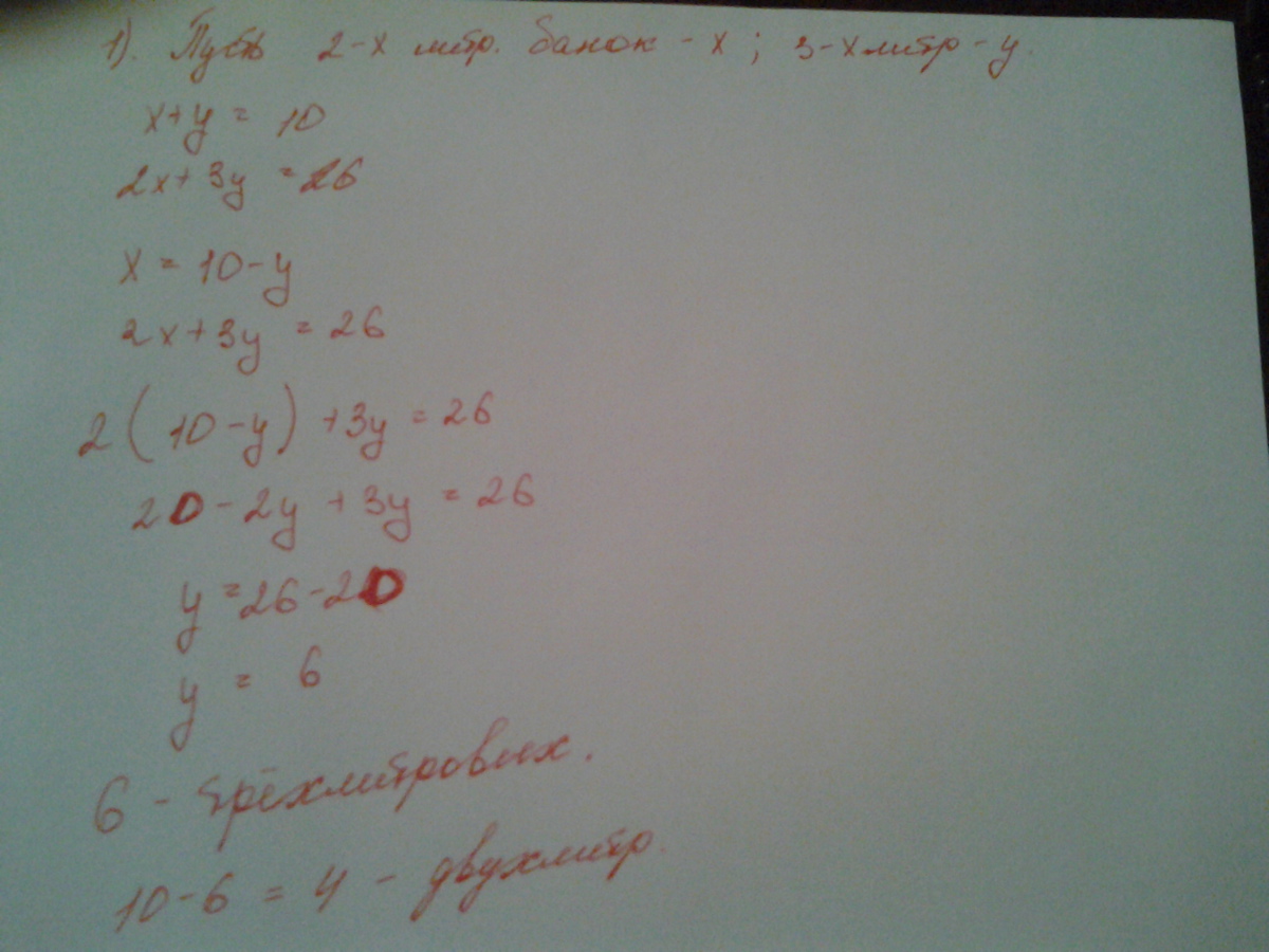 для разлива 26 литров сока хозяйка приготовила 10 банок двух и трехлитровых. Сколько банок каждого вида приготовила хозяйка ?