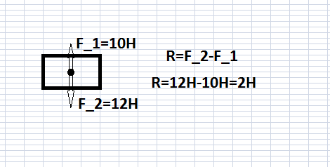 1. На тело действуют две силы: вверх, равная 10 Н, и вниз равная 12 Н. Куда направлена и чему равна равнодействующая этих сил? Изобразите на рисунке, выбрав масштаб: 1 клетка – 2 Н.