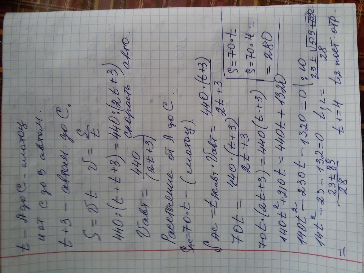Расстояние между городами A и B равно 440 км. Из города A в город B выехал автомобиль, а через 3 часа следом за ним со скоростью 70 км/ч выехал мотоциклист, догнал автомобиль в городе C и повернул обратно. Когда он вернулся в A, автомобиль прибыл в B. Найдите расстояние от A до C. Ответ дайте в километрах.
