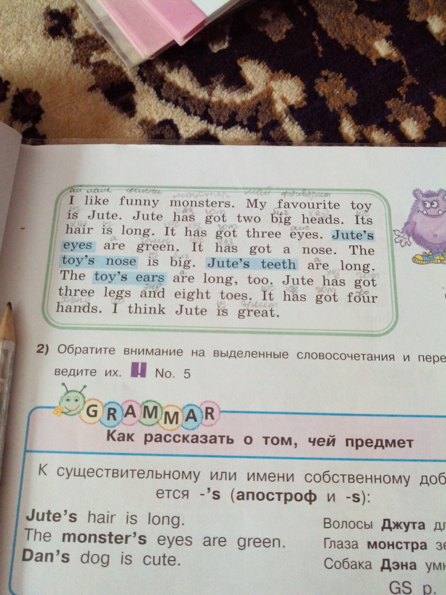 ай лайк фани монстрс.май фэйворит той ис джут.джут хэз гот ту бик хэдс. иц хея ис лон.ит хэз гот фри айс.джутс айс а грин.ит хас гот а ноус( там мягкая о). зе тойс ноус ис бик.джутс тиф а лон. зе тойс ирс а лон ту.джут хэз гот фри лэгс энд эйт тоис.ит хэз гот фо хэндс.ай финк джут ис грейт