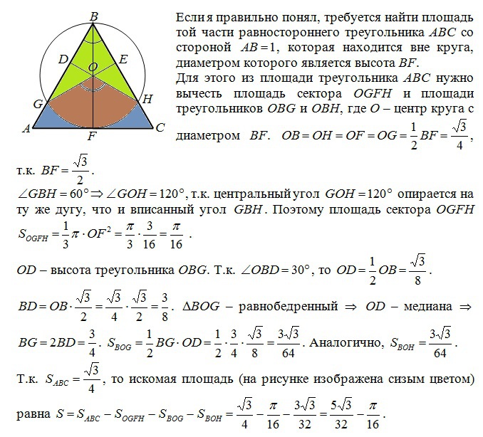 На висоті рівностороннього трикутника як на діаметрі побудовано круг. Довжина сторони трикутника дорівнює 1. Знайти площу тієї частини трикутника, яка лежить поза даним кругом.