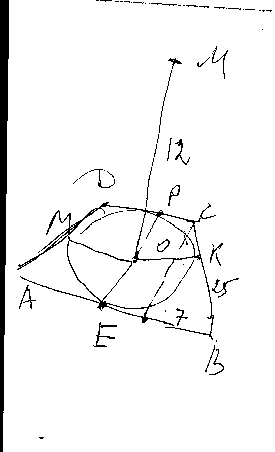 Точка М удалена от каждой стороны равнобедренной трапеции на расстояние 12. Основания трапеции равны 18 и 32. Найти расстояние от точки М до плоскости трапеции.
