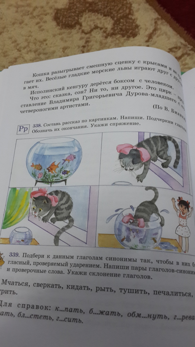 В аквариуме плаваЮТ(1 спр)рыбки. Котёнок сидИТ (2 спр))на подоконнике и наблюдаЕТ (1спр)за рыбками. Вдруг он прыгаЕТ (1спр) вниз и падаЕТ(1 спр)прямо в аквариум . Котёнок чуть не утонУЛ (1спр), но его спасЕТ (1спр) девочка.