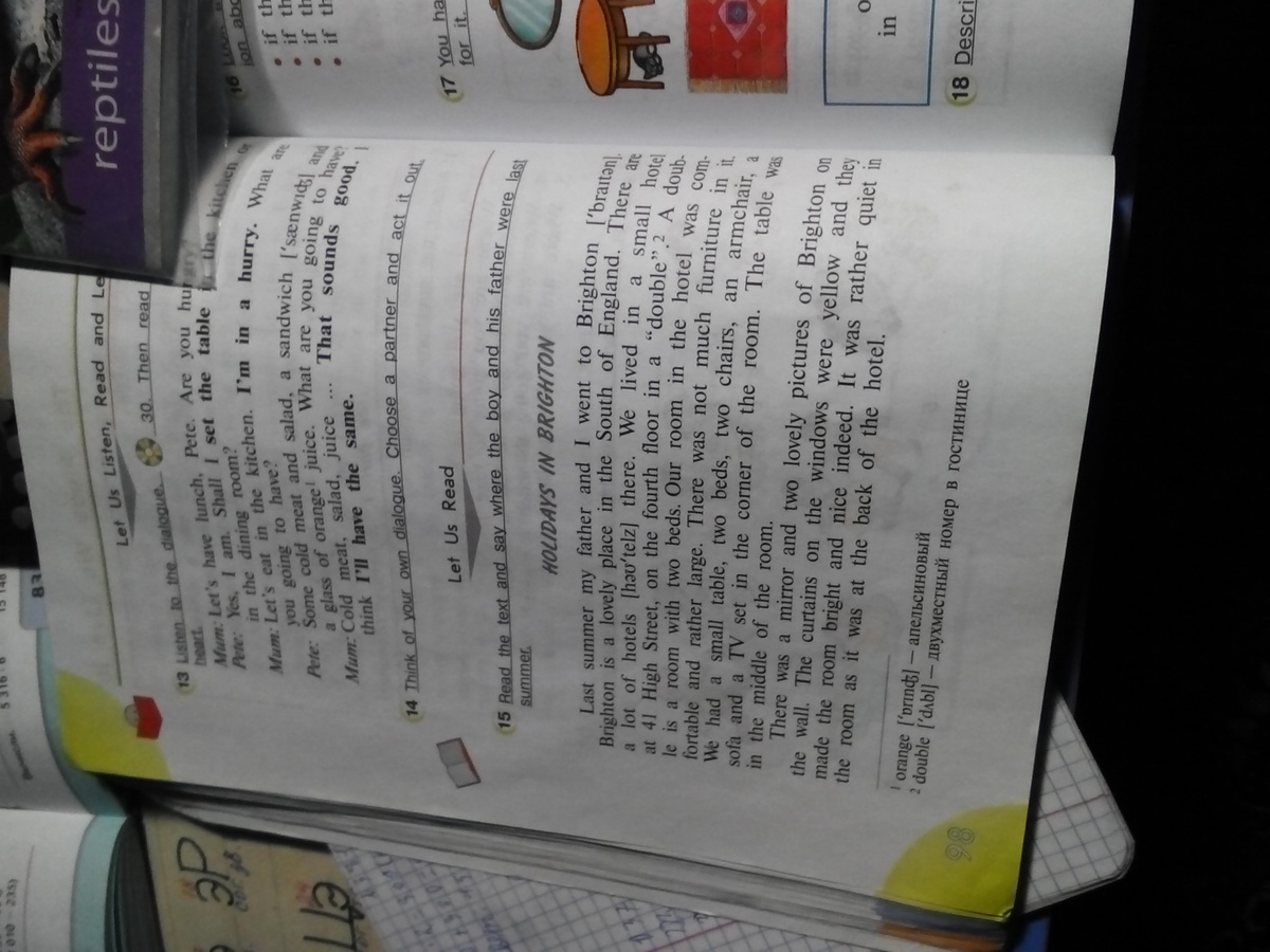 Прошлым летом мой отец и я поехали в Брингтон. Брингтон-это красивое место на юге Англии. Там есть много отелей. Мы жили в маленьком отеле на 4 этаже в двуместном номере на 41 Хай Стрит. Двуместный номе - это комнота с 2 кроватями. Наша комнота в отеле была удобная и даже большая. В ней не было много мебели. У нас был: маленький стол, 2 кровати, 2 стула и 2 кресла, диван и спутниковое телевидение в углу комнаты. Стол был посередине комнаты.